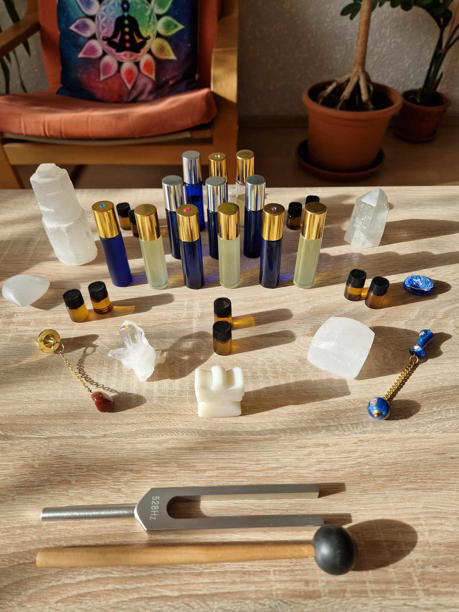 Parfémy se nabíjejí mezi krystaly a jsou navibrovány hlasem, léčivými zvuky a tóny.