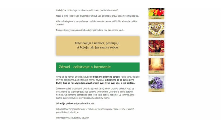 Milá Helenka ! Pred časom som si kúpila Tvoj kurz - Choroba prichádza preto, aby nás uzdravila. Krásne napísané, zrozumiteľne, logicky vysvetlené, množstvo textu a praktických cvičení. Ďakujem. Začala som pracovať so svojim strachom, emóciami a objavovať vzťah k sebe samej. Učila som sa mať rada, povedať NIE, že nič nemusím a čo vlastne od života chcem. Začala som cvičiť, píšem si za čo som každý deň vďačná a zmenila som zamestnanie. Konečne stojím na vlastných nohách a kráčam správnym smerom.