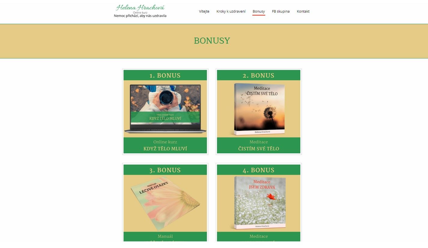Helenka ve svém online kurzu - i v bonusovém kurzu Když tělo mluví - dokázala velmi srozumitelným a uchopitelným způsobem přiblížit pravé příčiny různých potíží. Velmi se mi líbí rozdělení z pohledu nemoci, konkrétní části těla a mysli. Vysvětluje také, jak problém chápat a jak jej pomocí léčivých vět začít řešit.