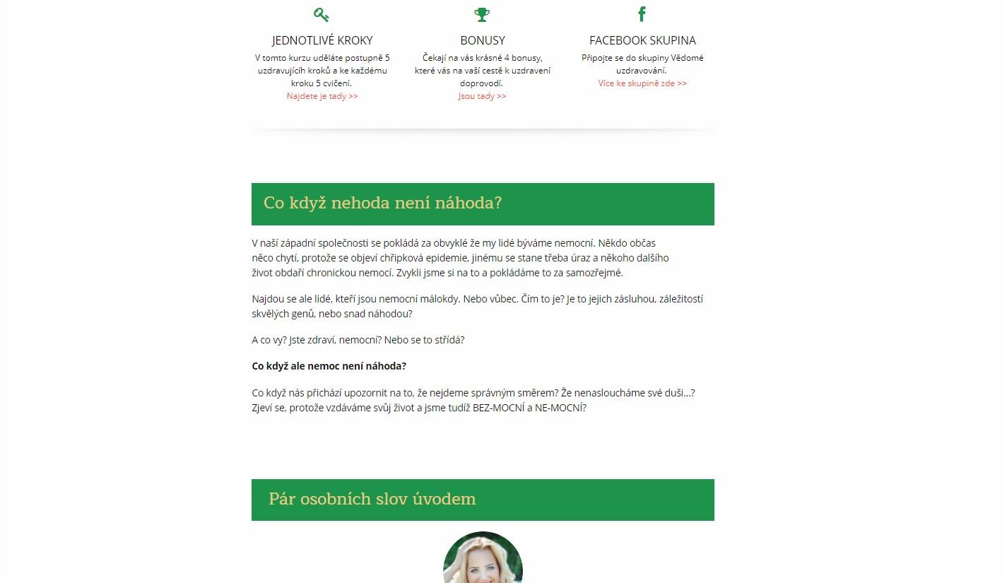 Nejdříve jsem k tomuto kurzu byla trochu skeptická. Věřím, že všechno začíná v naší hlavě, ale přece jen... Může snad obyčejná "síla myšlenky" vyléčit? Ovšem hned, jak jsem začala číst, jsem změnila názor. Bolest páteře, hlavy, špatný zrak i nespavost - tady všude jsem se našla a nestačila jsem se divit.
