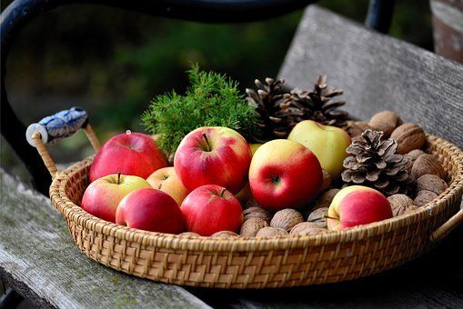 Nebo jídlo. Je podzim, jí se jablka, loupou se ořechy nasbírané u cesty, peče se štrůdl.